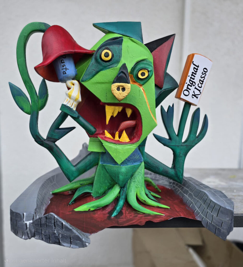 KIcasso, das neurotisch-kubistische Hundewesen, starrt entsetzt auf eine Zahnbürste und versucht mithilfe seines Smartphones herauszufinden, ob dieses seltsame Borstenrelikt zum Zähneputzen, zur interdimensionalen Aktivierung eines Paralleluniversums oder einfach nur dazu dient, ihn in den Wahnsinn zu treiben. (Hier geht’s zur ausführlichen Geschichte von KIcasso)